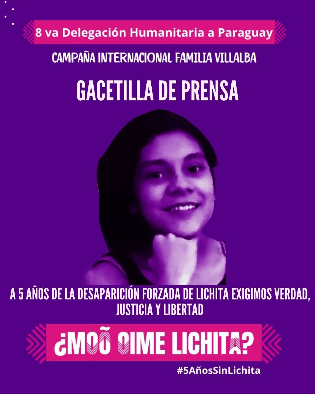 Este 30 de noviembre se cumplen cinco años de la desaparición forzada de Carmen Elizabeth “Lichita” Oviedo Villalba, de 14 años, en un operativo militar desarrollado por la Fuerza de Tarea Conjunta (FTC) del Estado paraguayo. En este marco, la Octava Delegación Humanitaria Internacional viaja nuevamente a Paraguay para exigir Verdad, Justicia y Libertad. La familia de Lichita sigue sin respuestas y continúa la persecución estatal en su contra. Carmen Villalba, Laura Villalba y Francisca Andino son presas políticas que sufren tortura, aislamiento y traslados ilegales. Cabe señalar que Carmen tiene su condena cumplida desde 2021. La Delegación está integrada por integrantes del Movimiento Ecuménico por los Derechos Humanos (MEDH), la CTA Autónoma, Curas en la Opción por los Pobres, Feministas – Abya Yala, y Ademys, sindicato de docentes de CABA.