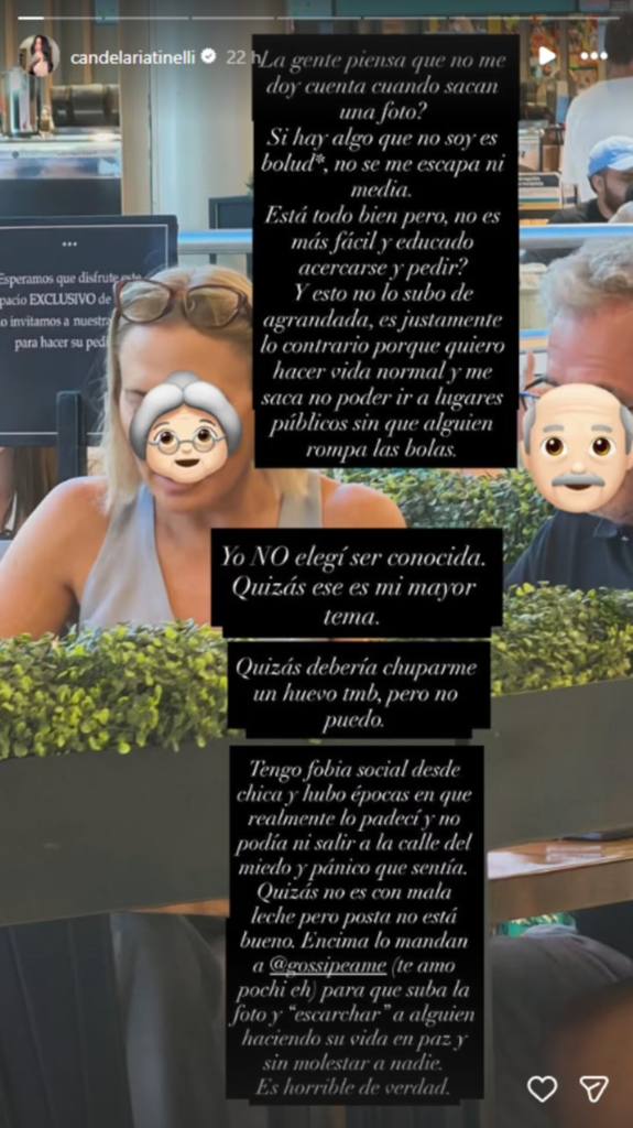 A través de sus historias de Instagram, relató lo ocurrido y aprovechó para revelar un aspecto personal de su vida: padece trastorno de ansiedad social, también conocido como fobia social. Este cuadro se caracteriza por un miedo intenso a situaciones donde la persona puede sentirse observada o juzgada.