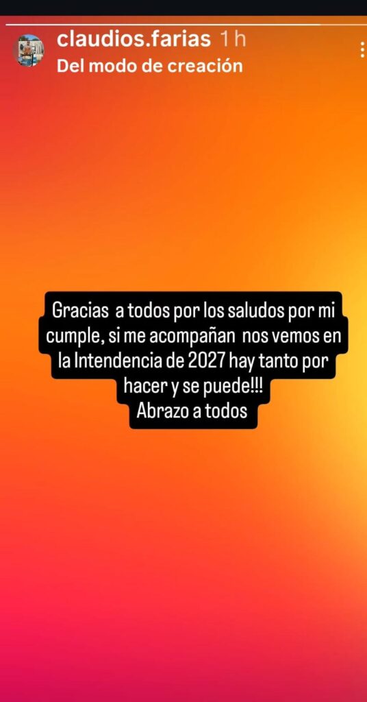 El ex intendente Claudio Farías volvió a meterse de lleno en la discusión política tras un mensaje publicado en sus redes sociales. En medio de los saludos por su cumpleaños, dejó una frase que no pasó inadvertida: “si me acompañan nos vemos en la Intendencia de 2027”.