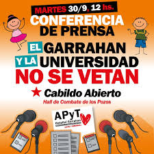 Representantes de la Junta Interna de ATE, la Asociación de Profesionales y Técnicos del Garrahan y la Asociación Gremial Docente de la UBA, entre otros sectores, convocan a una conferencia de prensa para este martes 30 de septiembre, a las 12, en Combate de los Pozos 1881 de la Ciudad de Buenos Aires, en la que informarán sobre las medidas de fuerza previstas para el 2 de octubre, cuando el Senado trate la insistencia contra los vetos a las leyes de emergencia en salud pediátrica y financiamiento universitario.