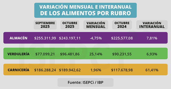Según el relevamiento mensual en los negocios de cercanía de los barrios populares del conurbano bonaerense que realiza el Instituto de Investigación Social, Económica y Política Ciudadana, a través de su Índice Barrial de Precios (IBP); tal como viene ocurriendo en los últimos meses, el rubro “carnes” encabeza los aumentos anuales (+61,47%), mientras que almacén y verdulería se incrementaron alrededor del 7% cada uno. A su vez, una familia de cuatro integrantes –dos adultos y dos hijos pequeños- necesitó 529.621,59 pesos para cubrir sus gastos de alimentación durante todo octubre. Esto es 22,18% más que un año antes.