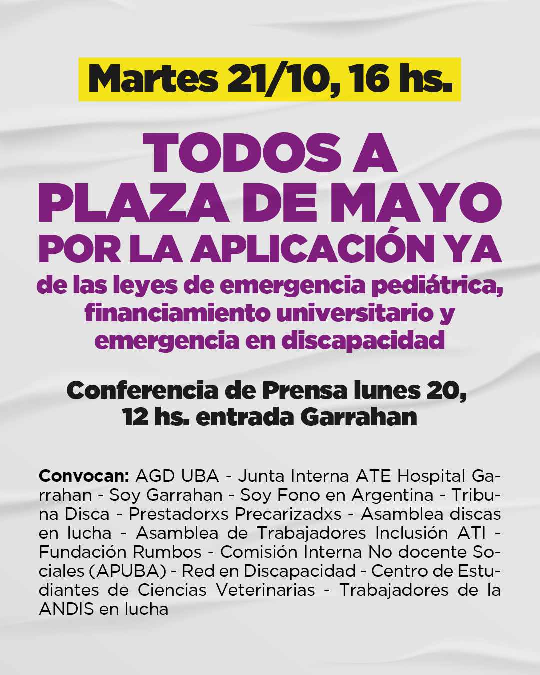 Entre las organizaciones convocantes se encuentran: Asociación Gremial Docente de la UBA – Junta Interna ATE Hospital Garrahan – Soy Garrahan – Trabajadores de la Agencia Nacional de Discapacidad en Lucha – Soy Fono en Argentina – Tribuna Disca – Prestadorxs Precarizadxs – Asamblea Discas en Lucha – Colectivo de Emergencia en Discapacidad – Asamblea de Trabajadores Inclusión – Fundación Rumbos – Comisión Interna No Docente Sociales (APUBA) – Red en Discapacidad – Centro de Estudiantes de Ciencias Veterinarias.