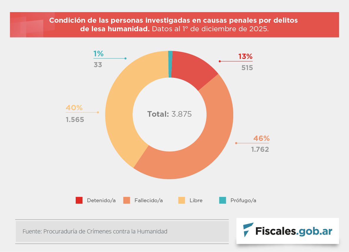 El informe refiere además que “del universo total de personas que han estado bajo investigación [3.875], 1.565 (40%) atraviesan el proceso de juzgamiento en libertad, mientras que 515 (13%) están detenidas. Como categorías residuales, se presenta un total de 33 prófugos y 1.762 fallecidos/as. De éstos, 1.252 murieron antes de obtener sentencia y 510 luego del dictado de una condena o absolución”.