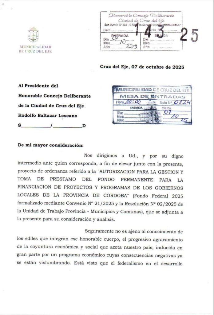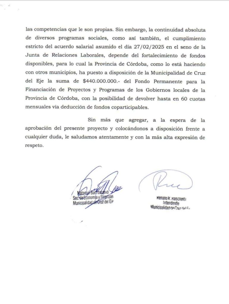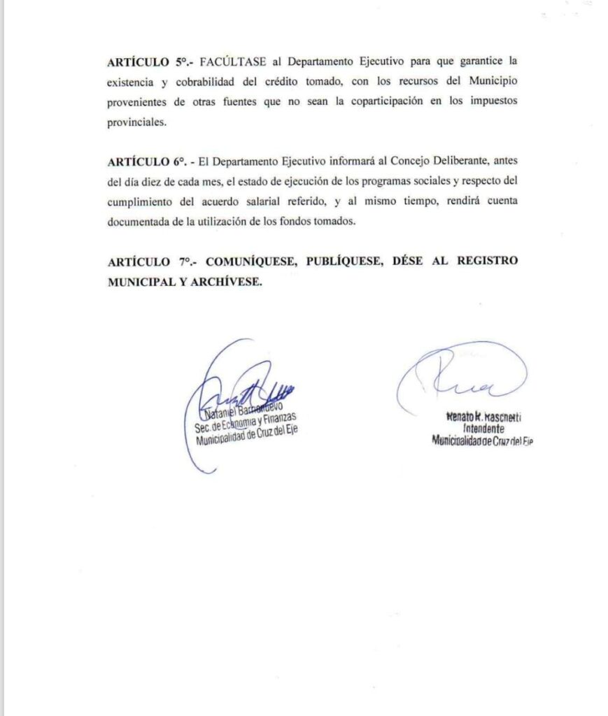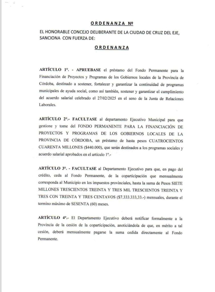 El préstamo que impulsa Raschetti comprometerá las finanzas municipales hasta el año 2030, con cuotas mensuales que se descontarán de la coparticipación provincial. En otras palabras, serán los vecinos de Cruz del Eje quienes paguen durante los próximos cinco años el precio del desmanejo actual.