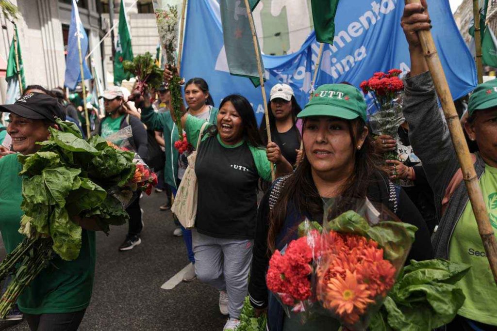 El camión repleto de jaulas de puerro, lechuga, banana, frutilla, rabanitos, hinojo, yerba y leche en polvo lideró el trayecto de la marcha desde el Obelisco hasta Plaza de Mayo, a donde llegaron las organizaciones de la Mesa Agroalimentaria Argentina —Unión de Trabajadores y Trabajadoras de la Tierra (UTT), el Movimiento Nacional Campesino Indígena – Somos Tierra (MNCI-ST), la Federación de Cooperativas Federadas (Fecofe) y Bases Federadas—. El “Alimentazo” denominaron a esta acción solidaria de protesta que recobró el espíritu de los “verdurazos” de la UTT durante el gobierno de Mauricio Macri. Ahora frente a las políticas de ajuste de Milei con costos en dólares, precios deprimidos por la falta de poder adquisitivo, políticas públicas de agricultura familiar arrasadas y paralización del INTA.