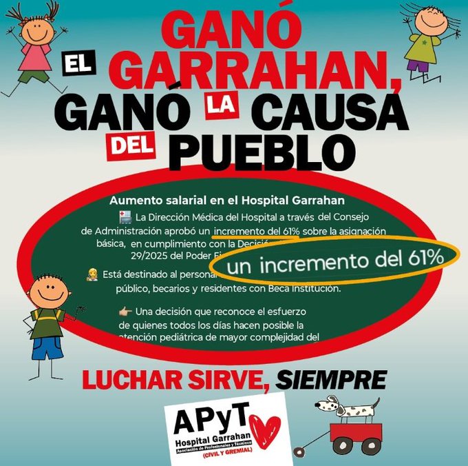 “Sin admitirlo, el gobierno empieza a aplicar parcialmente la ley votada en el Congreso. Es un extraordinario triunfo de la lucha del Garrahan, que conmovió a la Argentina durante meses. Es, a la vez, una derrota de Milei, Lugones y la gestión del Garrahan, que se jugaron a reventarnos sistemáticamente sin lograrlo. En el país de las paritarias al 1%, la huelga del Garrahan reventó ese techo a fuerza de una pelea incansable. Asambleas generales sin distinción de afiliación, tarea o sector; paros; movilizaciones; festivales; acciones de visibilización y un sinfín de hechos que tuvieron como protagonistas a los trabajadores y trabajadoras del hospital, acompañados por un apoyo popular sin precedentes. Es total el contraste entre los resultados obtenidos por la metodología del Garrahan (sindicatos combativos, unidad en la asamblea general, planes de lucha) y la ruina de salarios a la baja y despidos cuando domina la burocracia sindical”, expresaron desde la Junte Interna de ATE Garrahan tras conocerse la noticia.