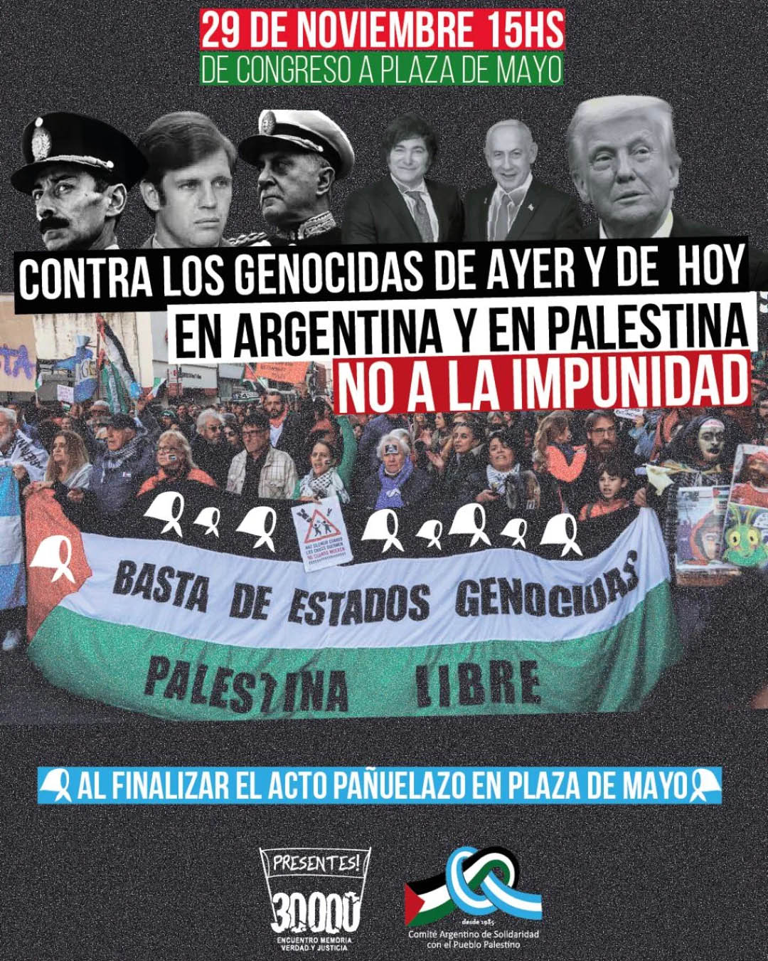 Desde el Encuentro Memoria Verdad y Justicia y el Comité Argentino de Solidaridad con el Pueblo Palestino, junto a otras organizaciones, convocan este sábado 29 de noviembre, a las 15, para marchar desde el Congreso hasta Plaza de Mayo contra los genocidas de ayer y hoy en Argentina y en Palestina. Al finalizar el acto, habrá un pañuelazo en Plaza de Mayo.